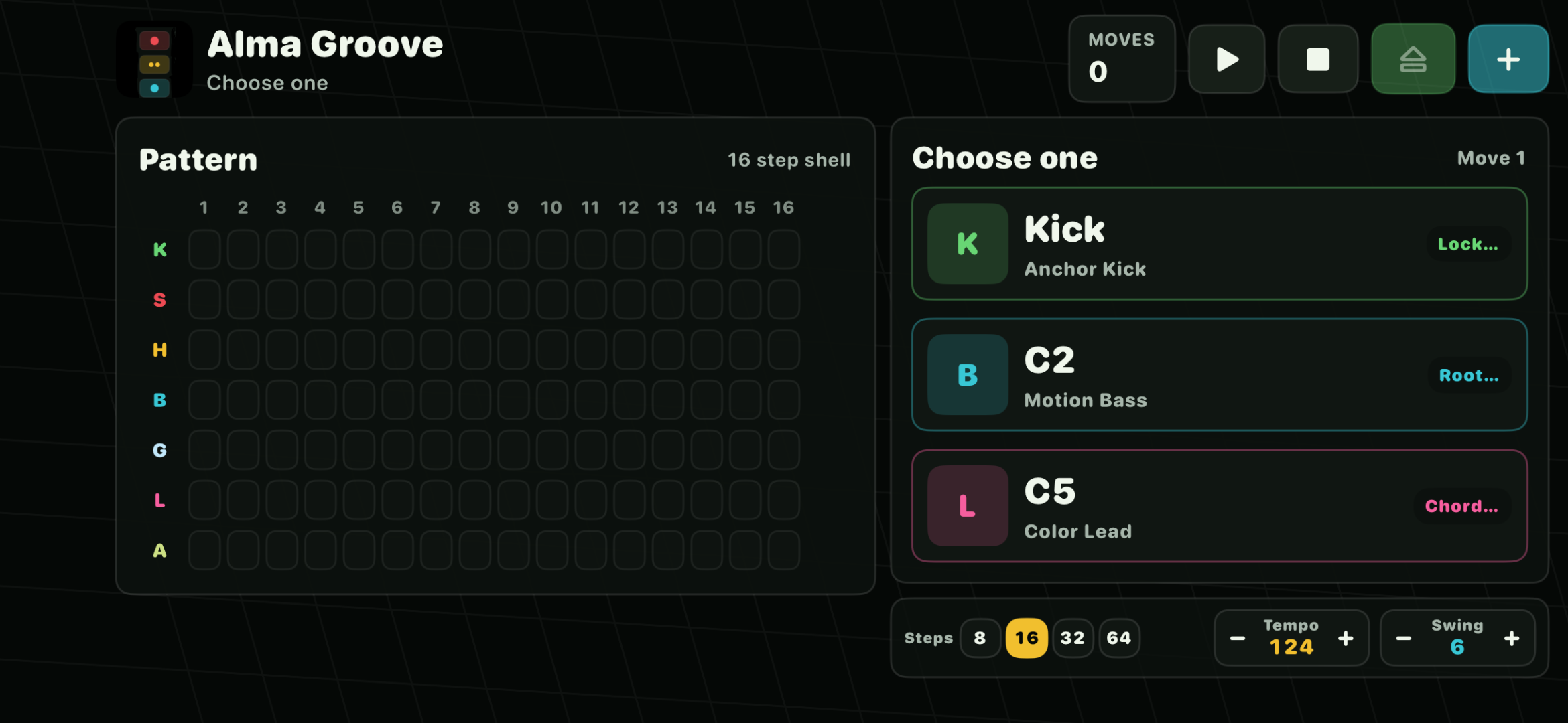 We do that by keeping the surface tiny and the sound generous. Pick a patch — it already sounds great. Tap a grid, or tilt a device, or let Alma Groove improvise back at you. If you want more, every app scales up; if you just want fun, none of them get in your way.