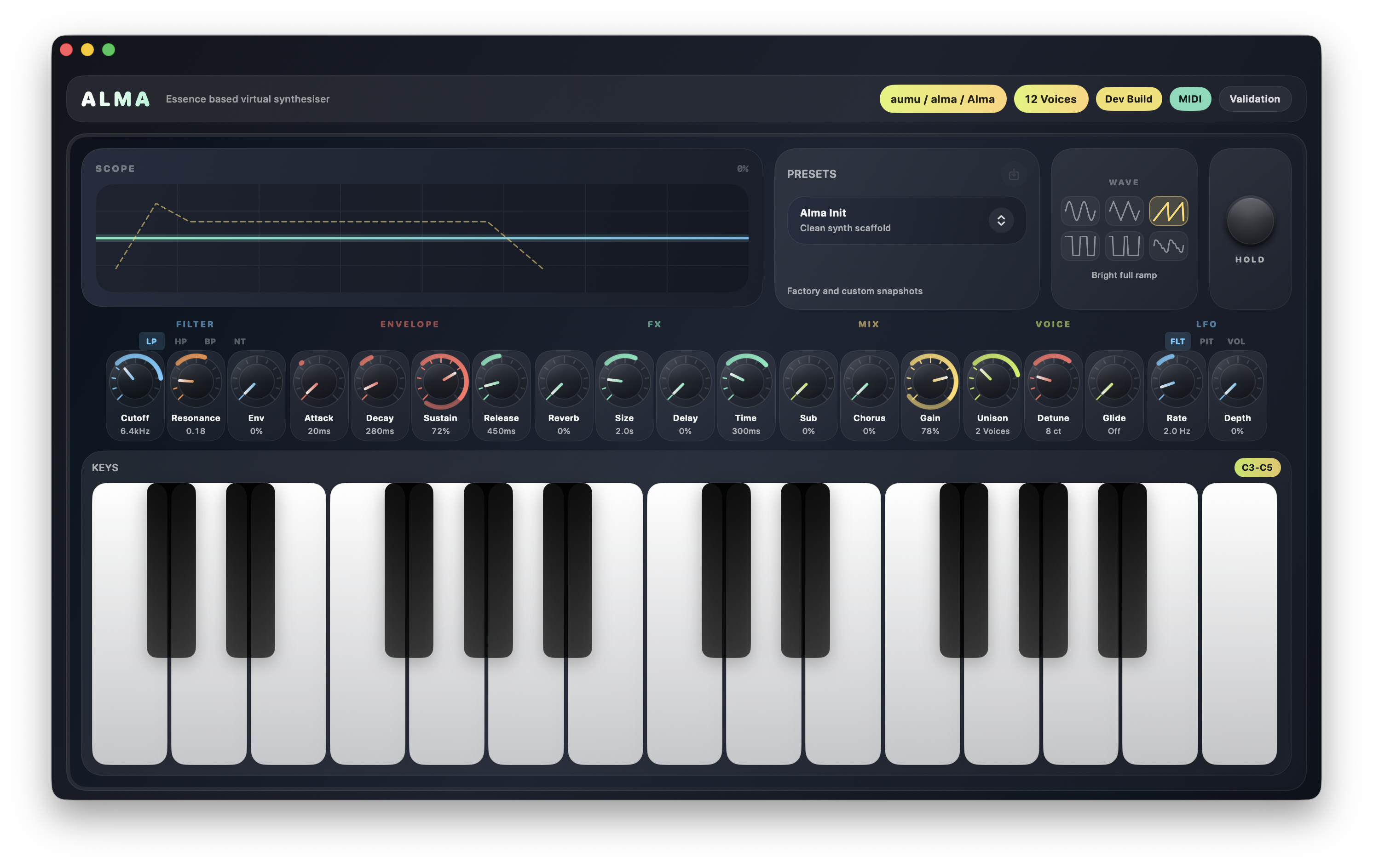 Most music tools assume you already know what a scale is, what a VST does, and how to route MIDI. Alma doesn't. The goal is the opposite: give someone who never played an instrument the same first-time thrill a musician gets when a song starts coming together.